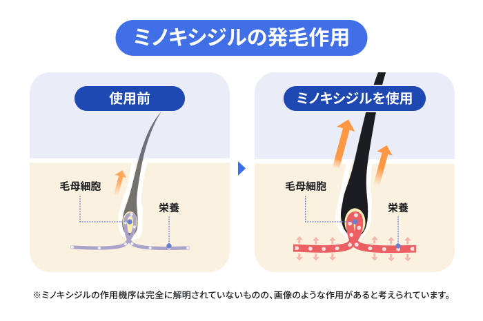 ミノキシジルの作用機序は完全には解明されていません。しかし、ミノキシジルがもつ血管拡張作用により毛包周囲の血流を改善する作用があると考えられています。これにより毛根に酸素や栄養が届きやすくなることで、発毛を促進する効果が期待できるでしょう。