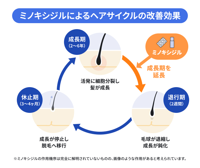 髪の毛はヘアサイクル(毛周期)と呼ばれる、「成長期」「退行期」「休止期」という3つのフェーズを繰り返して成長しています。AGAが進行すると、約2~6年あるはずの成長期が数ヶ月~1年程度に短縮されてしまいます。ミノキシジルは毛包に直接作用しヘアサイクルの成長期を延長すると考えられており、髪が太く強く育ちやすくなることが期待されています。