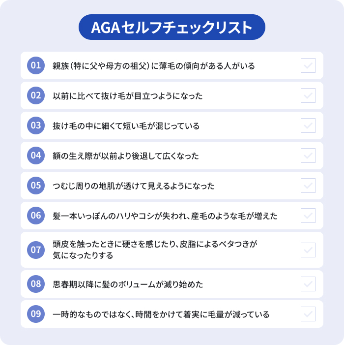 チェックがついた項目が多いほど、AGAが進行している可能性があります。ここでは、自分でできるAGAのチェック方法について解説します。