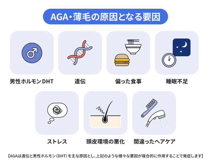 薄毛や抜け毛の原因の一つには、AGAの発症も考えられます。AGAは進行型の脱毛症で、徐々に前頭部や頭頂部の毛髪が薄くなっていきます。発症の原因は上記で挙げた要素が間接的に関わっていると考えられています。