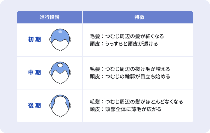 つむじはげの進行は、一般的に次の3段階で進みます。
