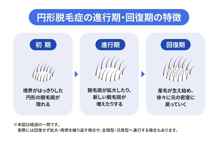 円形脱毛症は突然脱毛が起こる「初期」と、症状が広がる「進行期」、時間をかけて髪が再生する「回復期」に分けられます。各段階の特徴を理解することで、現在の自分の状態を客観的に把握し、適切なケアにつなげることができるでしょう。