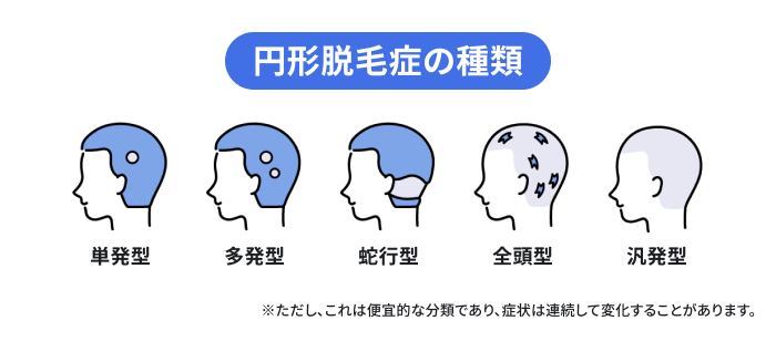 円形脱毛症は、その広がり方によって以下の5つのタイプに分けられます。