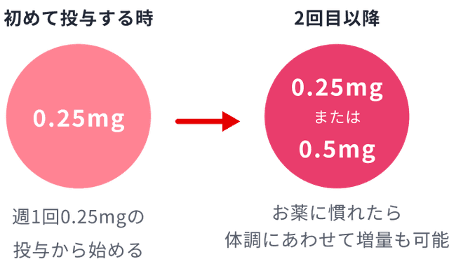 初めて投与する場合は、週1回0.25mgの投与から始めて、お薬に慣れてきたら週1回0.5mgに増量して投与することがおすすめです。